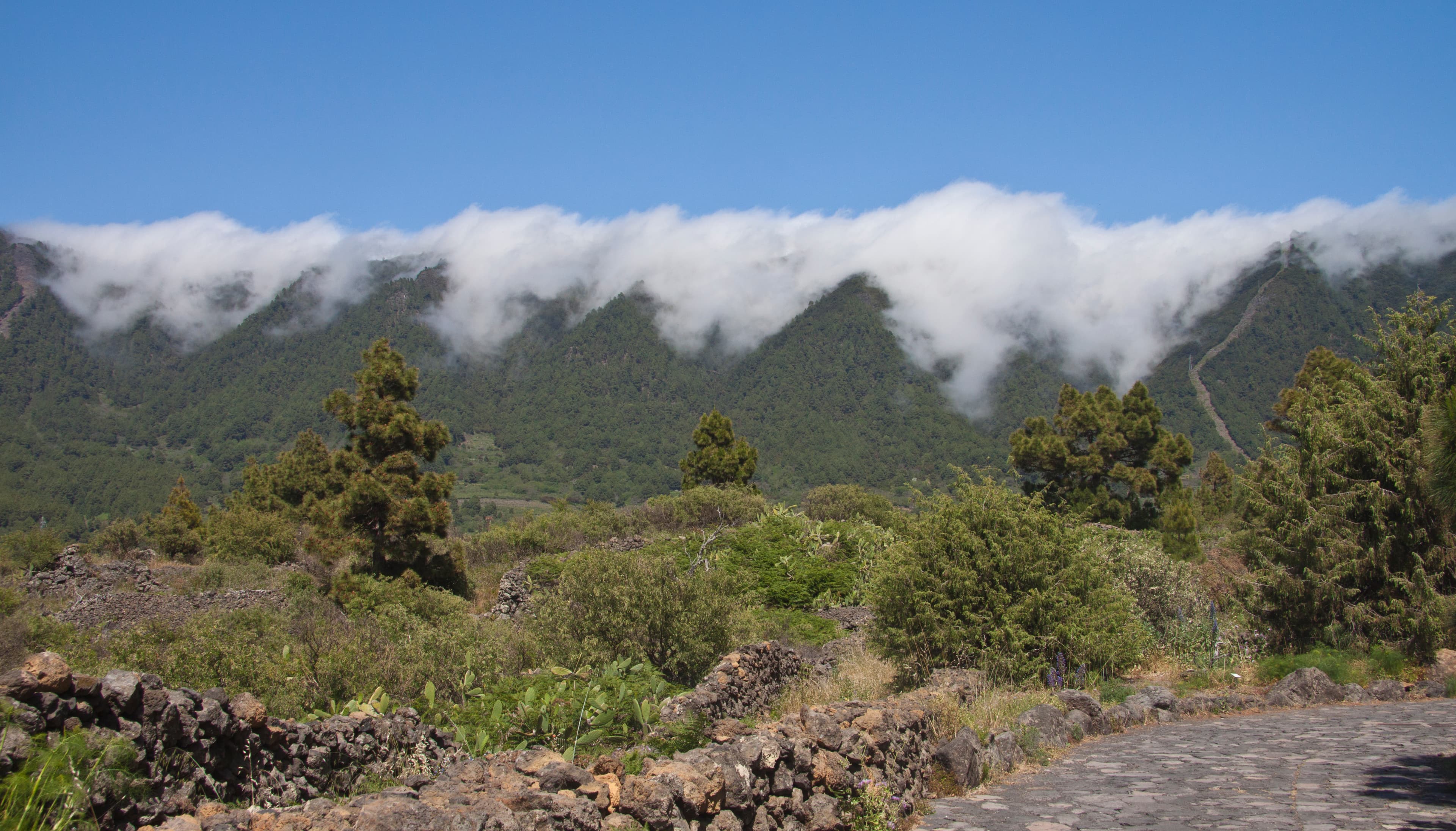 The year-round mild climate of the island hardly differs from that of the neighbouring islands of Tenerife, La Gomera and El Hierro. It is dominated by the trade wind clouds and the Canary Islands current. The trade wind clouds rain in the northeast, while the southwest of the island is rather dry. But even if the trade wind clouds do not rain down, they remain on the island as so-called cloud water. Due to the large stock of Canarian pines, the clouds "hang" on the trees as fog condensation. The long needles of the Canary pines ensure that the water can drip off into the ground. It is then stored in the soil. And it is impressive to look at when huge masses of clouds roll like a roller over the crest of the Cumbre and then dissolve in the west.