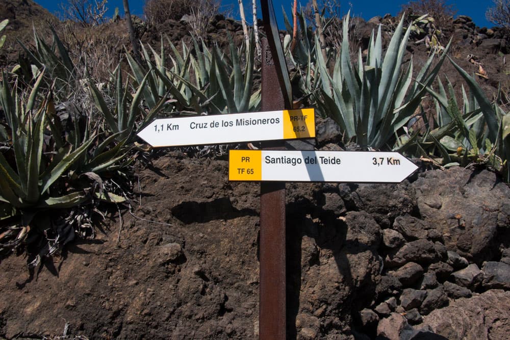 There is already a sign to the hiking trail to Cruz Misioneros. Follow this and you will quickly reach Barranco Santiago via a small path. There you meet the Camino Real, which leads from Los Gigantes to Santiago del Teide (PR TF-65 marked yellow-white). Follow this road in the direction of Santiago del Teide. Cross the Barranco bed, climb up on the other side and turn right towards Santiago del Teide instead of left towards Cruz de Misioneros.