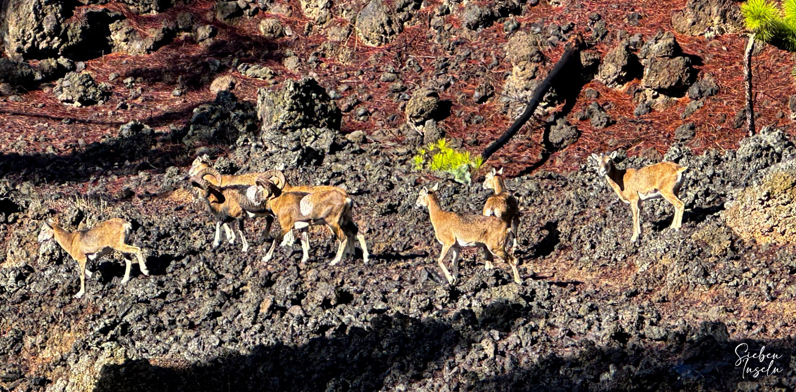 Fue una absoluta coincidencia. En realidad, ese día queríamos hacer senderismo por el norte de Tenerife. Pero llovía mucho y se veía muy oscuro hacia el norte. Así que decidimos quedarnos en el suroeste y caminar un poco por encima de Arguayo hacia el Parque Nacional del Teide. Y aunque el tiempo estaba mezclado con un poco de lluvia, nubes y también sol, caminamos hacia el Teide. De repente y de forma totalmente inesperada, un grupo de 8 muflones se puso delante de nosotros. Al principio no me lo podía creer, ya que nunca había visto a estos tímidos animales a lo largo de tantos años en Tenerife con interminables caminatas. Al principio pensé que tal vez eran cabras salvajes después de todo.