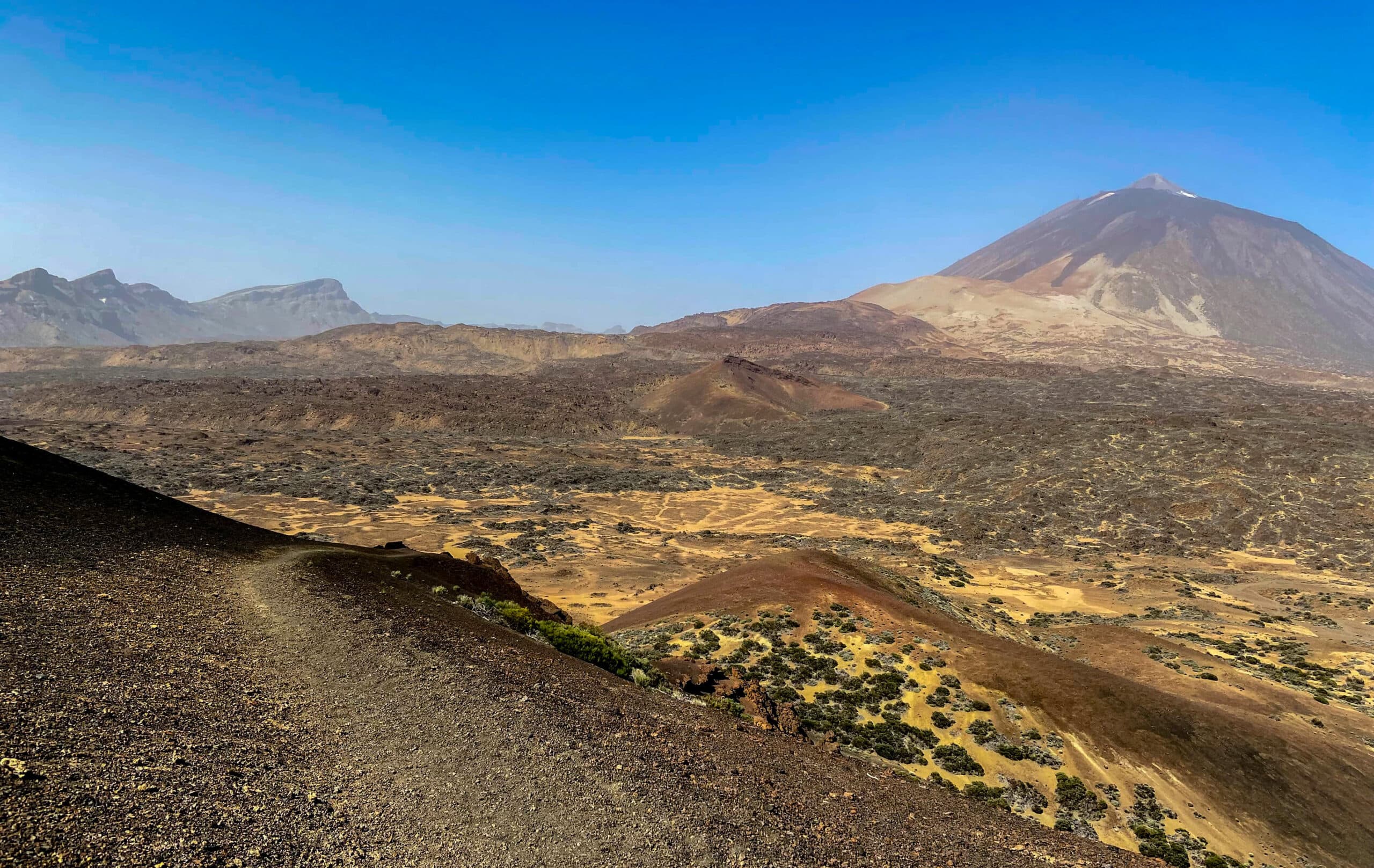 Vista desde el sendero de ascenso Montaña de las Arenas Negras hacia el Teide y las Cañadas